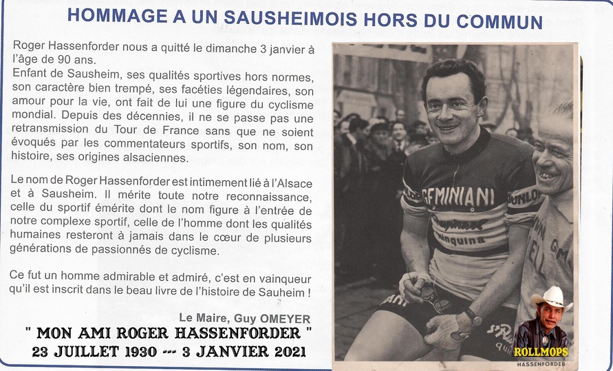 un peloton de quelque 80 personnes masquées composé de la famille, dont sa fille Olivia et sa sœur Monique, de proches et d'anciens cyclistes a rendu un dernier hommage à Roger Hassenforder, décédé dimanche à Colmar à l'âge de 90 ans, lors de ses obsèques ce vendredi à l'église de l'Invention-de-la-Sainte-Croix de Kaysersberg. Le contexte sanitaire a freiné nombre de personnes à venir le saluer une dernière fois, ce qui n'a pas empêché l'émotion. Outre les fleurs jaunes du Tour de France, dont il a porté le maillot de leader durant quatre jours en 1953, celles de la commune de Sausheim, en présence de son maire Guy Omeyer, ou encore celles du restaurant éponyme, Michel Callot, le président de la Fédération française de cyclisme, était représenté par Jean-Claude Claudel, président du comité du Grand Est.